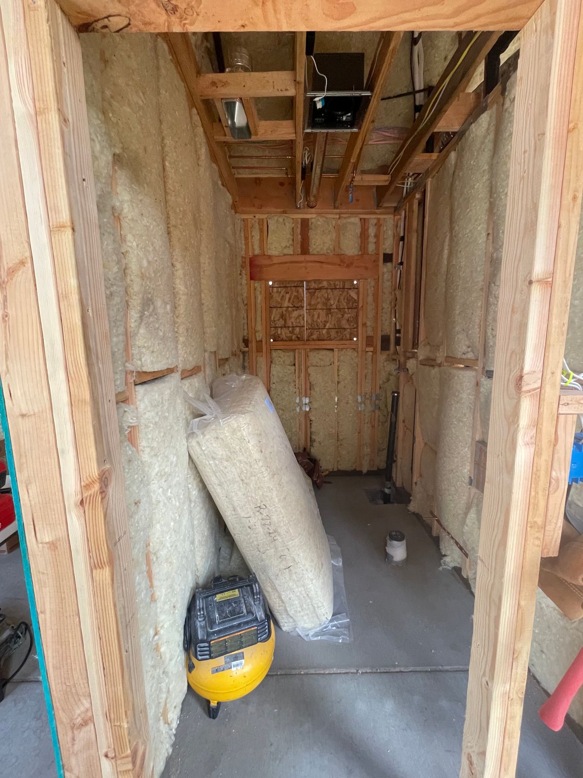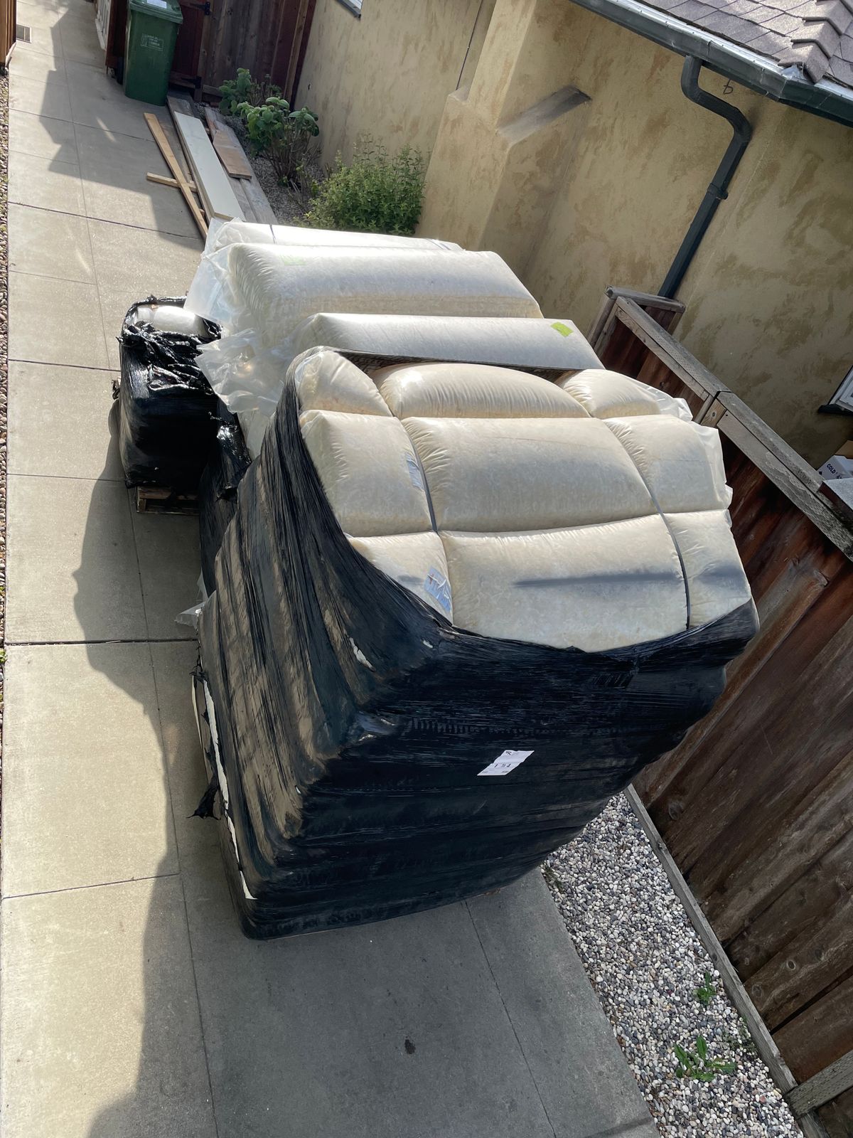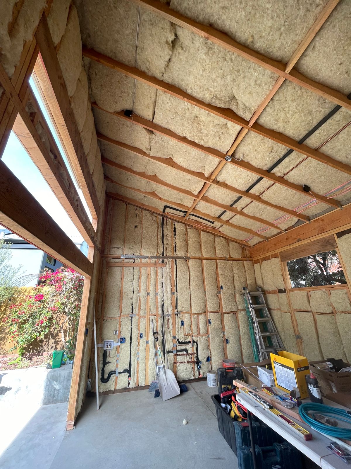 Just about finished insulating me new shed - I have many hobbies - felting, weaving and dyeing so wanted a natural fiber in the walls and ceiling . I did all the work and it was easy to use !